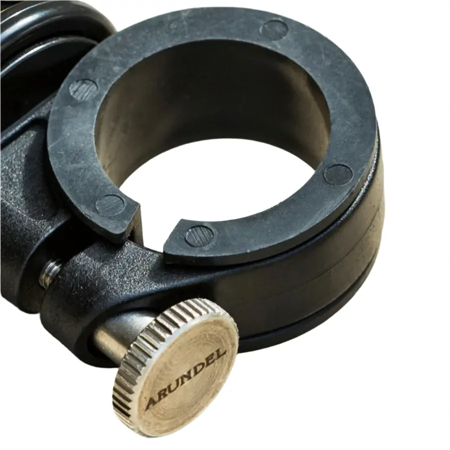 Stainless steel thumbscrew so you can install or remove the bell with no tools; fits 31.8 with a shim to fit 28.6.