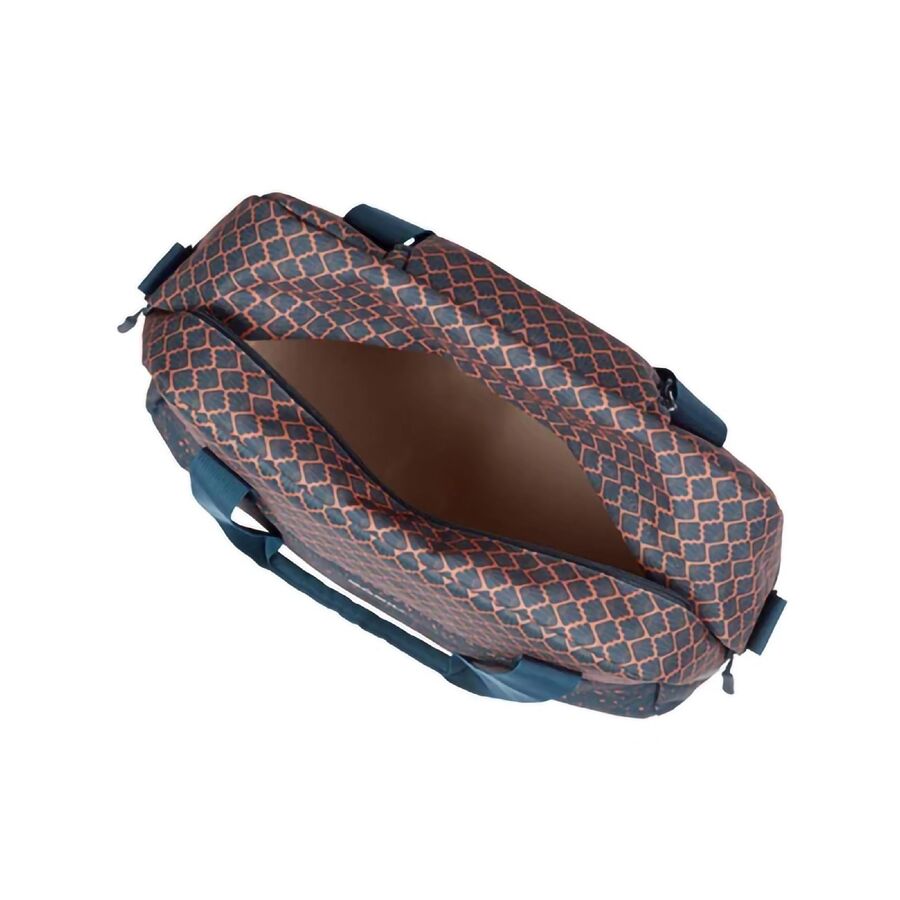 The bag features a sturdy inner lining, interior and front pockets, and faux leather details for a touch of elegance. The 1970s-inspired print adds a playful, retro charm, while the zipper closure keeps your items secure. Reflective accents on all sides enhance visibility, ensuring safety in low light conditions.