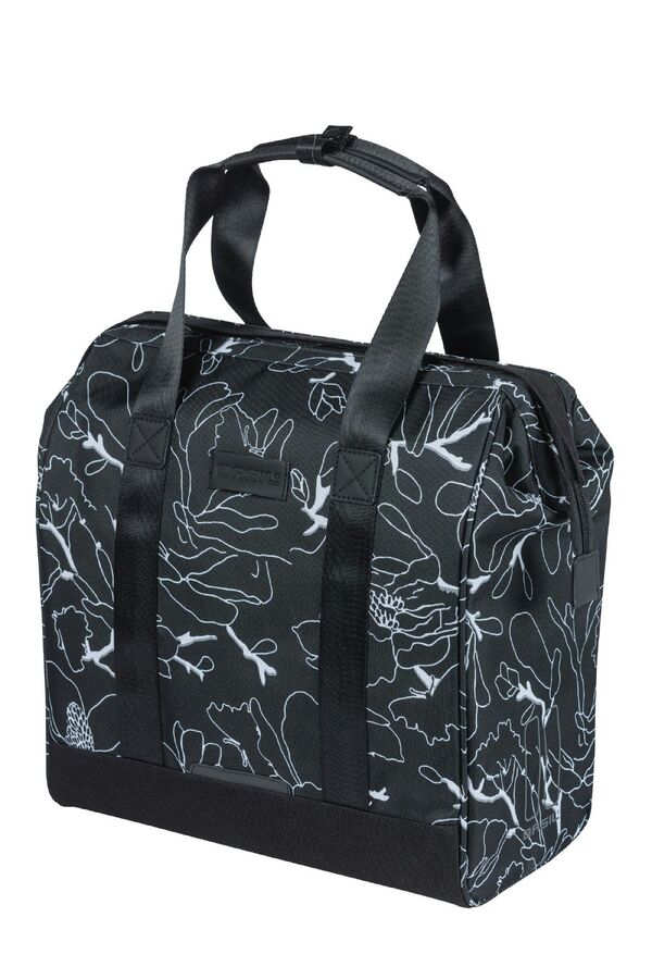 The Basil Grand bicycle shopper brings delight to shopping and various errands. Its elegance and opulence stem from its ebony hue and floral design. Crafted from water-resistant 600D polyester, it boasts a capacious main compartment housing a cushioned pocket suitable for a laptop. Ideal for academic pursuits or professional undertakings, its 23-litre volume accommodates essential groceries and sundry purchases. When positioned upright, the bag maintains its form flawlessly, providing a convenient receptacle for beverages.