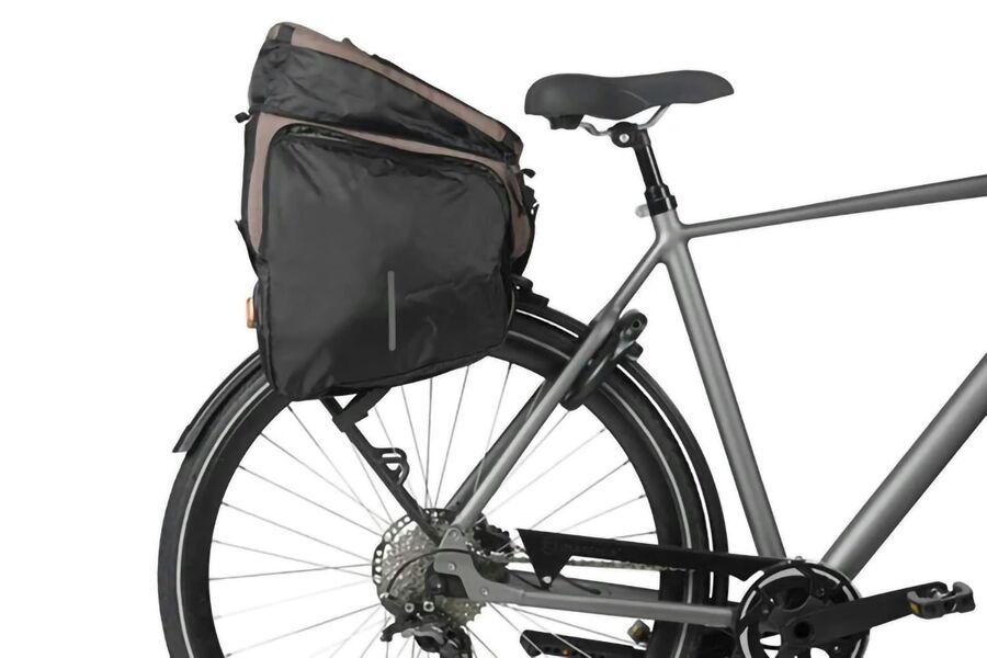 Crafted from water-repellent recycled polyester, it’s ready for unexpected showers. A sturdy handle, detachable shoulder strap, and Velcro fastening offer practical use on and off the bike. Reflective details keep you visible in low-light conditions. Available in black or brown, and compatible with MIK or Racktime adapter plates (not included).