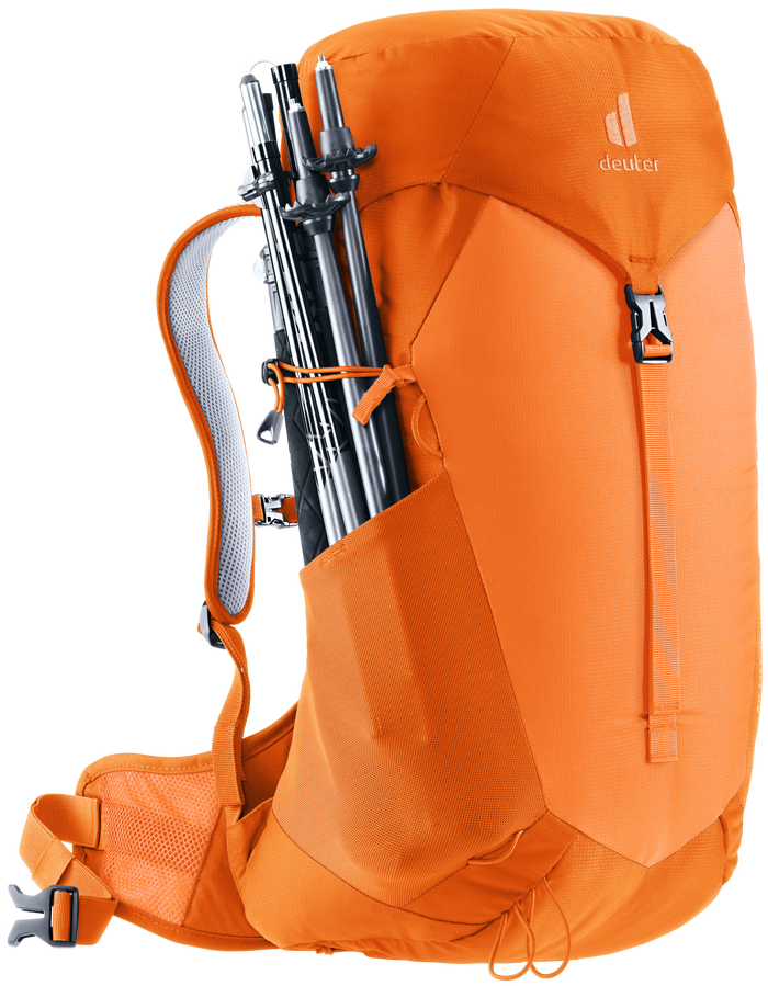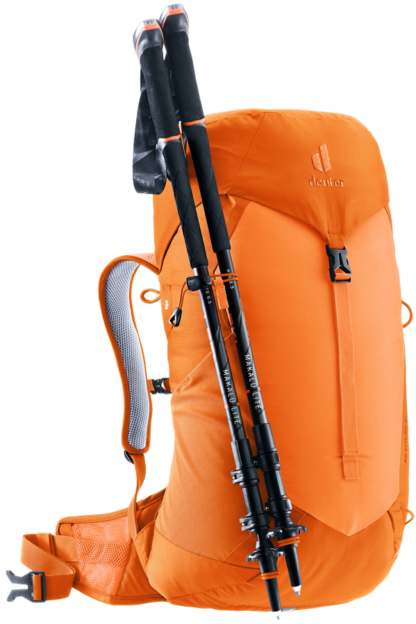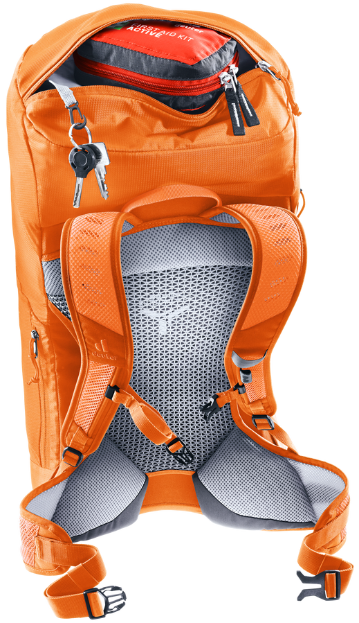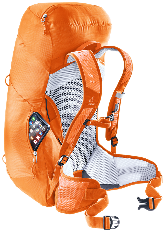 This comfortable day pack features the ultra-light deuter Aircomfort back system with maximum ventilation and offers an excellent comfort-to-weight ratio. It has a spacious main compartment and dedicated cell phone pocket, stretch side pockets, lid compartments and gear loops to strap poles and a range of gear to the outside of the pack. Prepped to accommodate a mesh helmet holder and hydration system (up to 2 L) and comes with a detachable rain cover.