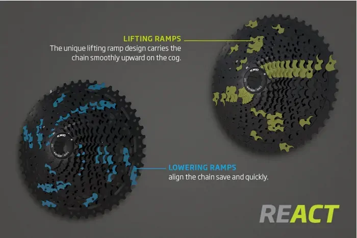 With the REACT series, KMC has filled a gap in its lineup of drive solutions. Just like KMC chainrings and sprockets, REACT cassettes are precisely designed to match KMC chains. This perfect synergy reduces friction between individual components and enhances the lifespan of all drive components. Meticulously crafted ascent and descent ramps ensure precise chain guidance, improving shifting performance across the entire range. Made from high-strength steel, REACT cassettes are compatible with Shimano HG.