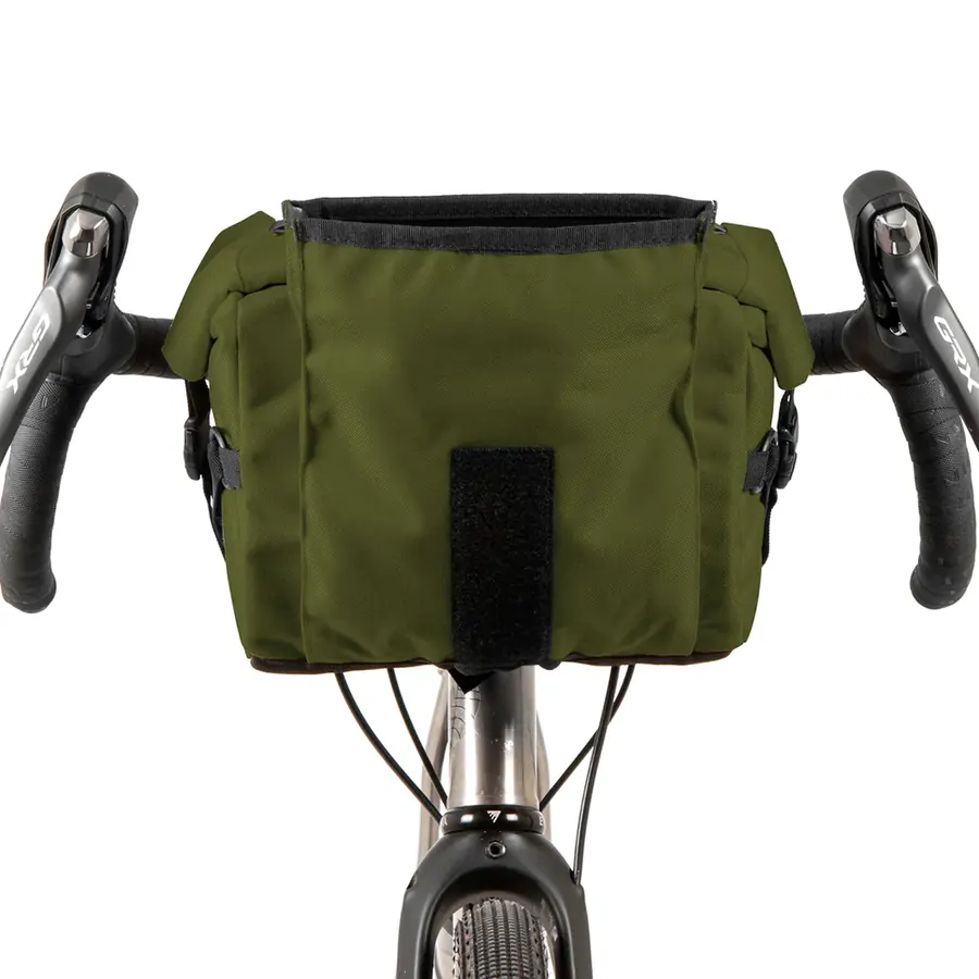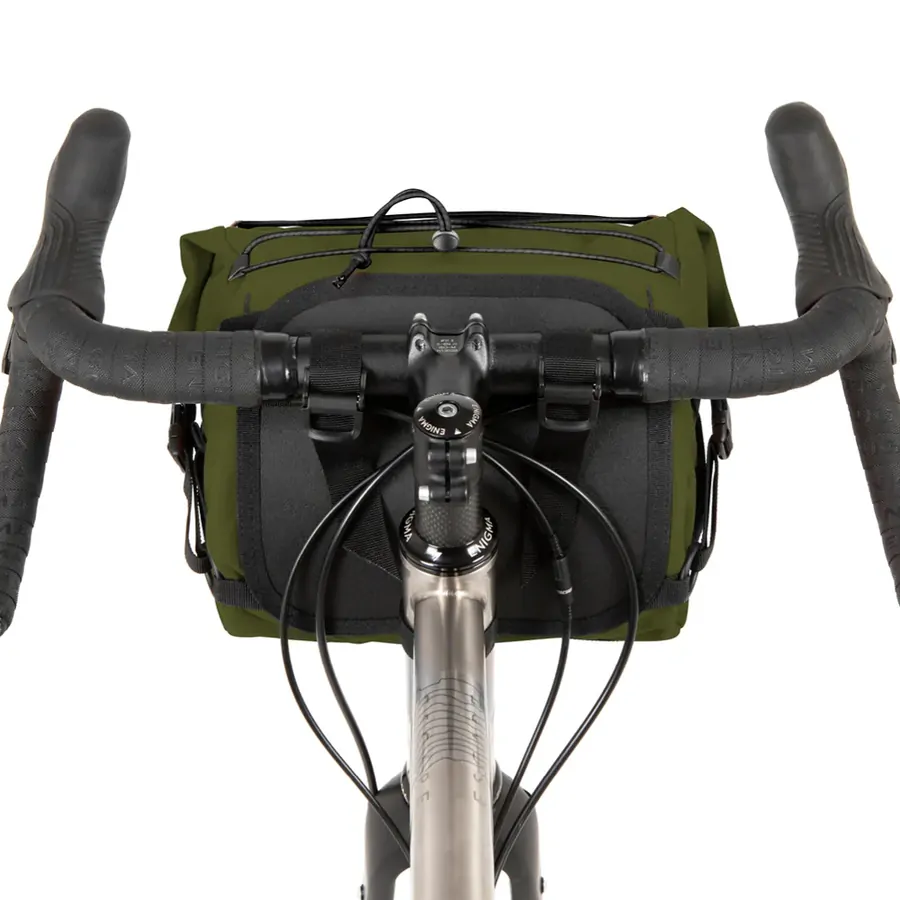 Ideal for shop runs, off road adventures or audaxes, the Bar Pack is the perfect all day companion. Two fully waterproof roll top compartments provide 10 litres of capacity with a hypalon closure, securing the front compartment and providing a mounting slot for a clip-on front light or additional strapping. A mini D-lock holster sits between the two compartments, with the front compartment closure doubling as a securing strap for a lock for any urban excursions.