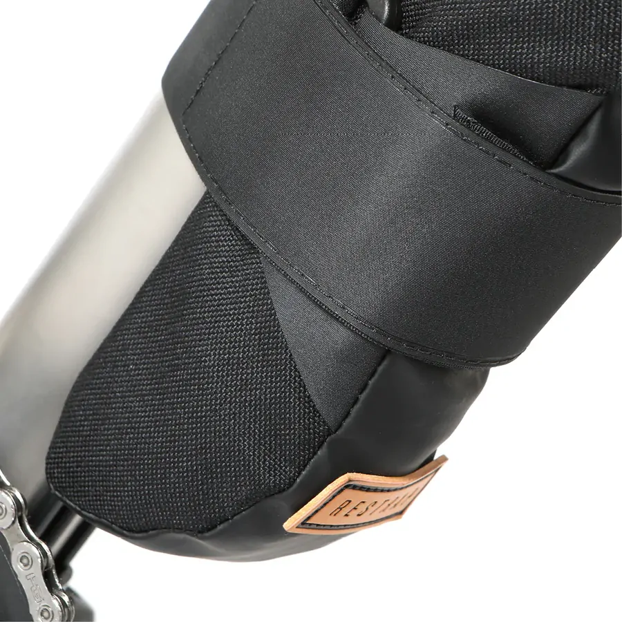 Constructed with a roll-top closure, the bag ensures that water, road spray, and trail debris stay out. A single Velcro strap, combined with a stitched-in grip pad, secures the bag tightly to your downtube, preventing movement and minimizing rattling during rides. The bolt-free attachment system also allows for quick and easy swaps between bikes.