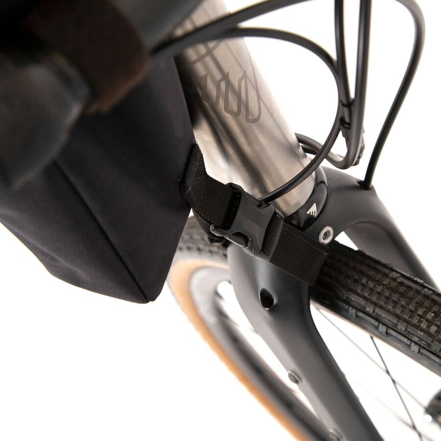 The bag features a convenient drawstring closure for quick access while riding. Adjustable Velcro straps and a fork support provide a secure fit on any bike setup.