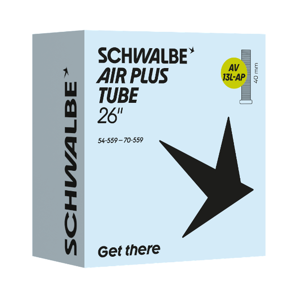Schwalbe AIR PLUS bicycle inner tube no. 13L-AP. For bicycle tires in the size 26" inch (ETRTO 54→70-559). Holds the air even longer thanks to wall thickness even longer. Less frequent re-inflation necessary. Also protects above-average protection against punctures.